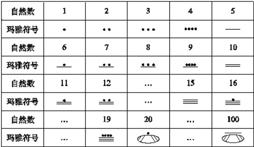 这种历法比古代希腊、罗马人的历法精确。与此同时,玛雅人创造了独特的以20进位的位值制记数法。所有数字都用三个符号来表示,这三个符号是“·”、“—”和贝形符号,分别表示1、5和0。他们很巧妙地把“·”排在“—”之上,以不同的排列组成1—19各个数字,如右上图所示。