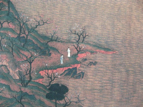 《游春图》以青绿色为主色调,并在此基础上,形成细工精琢的用色方法。例如,在画面右上部分,作者开始运用青绿着色,展现了初春山林间盎然的生机。而在右下部分,表现山间小路时,作者却用泥金来表现,展现了山林中春寒未退的山色。这样两类用色,使整个画面的表现力更加丰富。