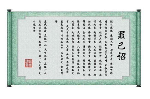 但是,自秦始皇宣告“命为‘制’,令为‘诏’”之后,“诏”的语权就变成皇帝的专利了。“罪己”,就是帝王责怪、自省自己的“口谕”,与“诏”字并用,就成了诏告天下的一种文书。