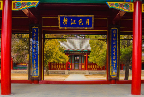 门殿北为静寄山房,是清帝读书处。房后莹心堂,亦为清帝书斋。堂后四合院,康熙帝题额为“湖山罨画”,开窗纵目远眺,湖光山色,罨映如画。门殿外的支柱,看上去似乎歪斜欲倒,实际上却坚牢稳固,这是山庄建筑三绝之一,据说这样的设计处于康熙的授意,寓意“上梁不正下梁歪”,用以警戒臣工。