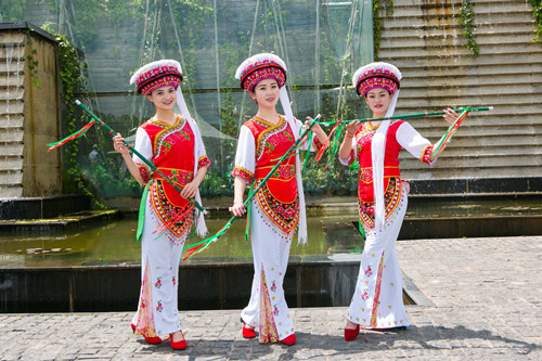 早在明清时期,史料对霸王鞭就有了非常明确记载。《百戏竹枝词·霸王鞭》载“徐沛伎妇,以竹鞭缀金钱,击之节歌,其曲名《叠断桥》,甚动听。行每覆蓝帕,作首妆”;诗歌:“窄样春衫称细腰,蔚蓝手帕髻衣飘。霸王鞭舞金钱落,恼乱徐州叠断桥。”与我们今天所能看到的白族霸王鞭几乎是如出一辙。