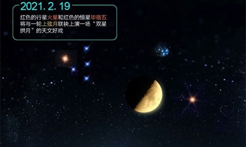 2月19日,红色的行星火星和红色的恒星毕宿五将与一轮上弦月联袂上演一场“双星拱月”的天文好戏。在天气晴好的条件下,我国感兴趣的公众肉眼可见这幕趣味天象。
