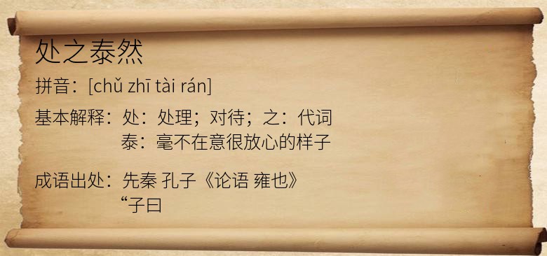 处:处理;对待;之:代词。泰:毫不在意很放心的样子。形容处理事情不慌不忙;沉着镇定。也指对事情无动于衷。也作“泰然处之”。