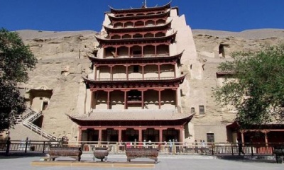 莫高窟,俗称千佛洞,坐落在河西走廊西端的敦煌。它始建于十六国的前秦时期,后历经北朝、隋、唐、五代、西夏、元等历代的兴建,形成巨大的规模,有洞窟735个,壁画4.5万平方米、泥质彩塑2415尊,是世界上现存规模最大、内容最丰富的佛教艺术地。