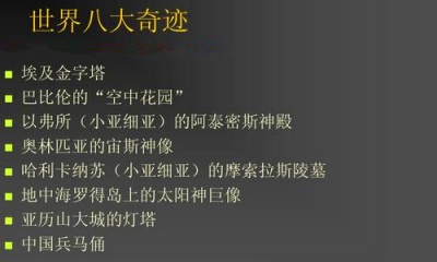 世界奇迹有很多,国际公认的世界七大奇迹:埃及胡夫金字塔、巴比伦空中花园、阿尔忒弥斯神庙、奥林匹亚宙斯神像、摩索拉斯陵墓、罗德岛太阳神巨像和亚历山大灯塔的基础上,再加上中国的秦陵兵马俑。“第八大奇迹”在世界上其实并没有定论。除秦始皇陵兵马俑外,也有说法将中国万里长城、印度泰姬陵、柬埔寨吴哥窟、意大利罗马斗兽场、梧州骑楼等称为第八大奇迹。“世界第八大奇迹”的说法更多的是一种赞誉而不是确指。